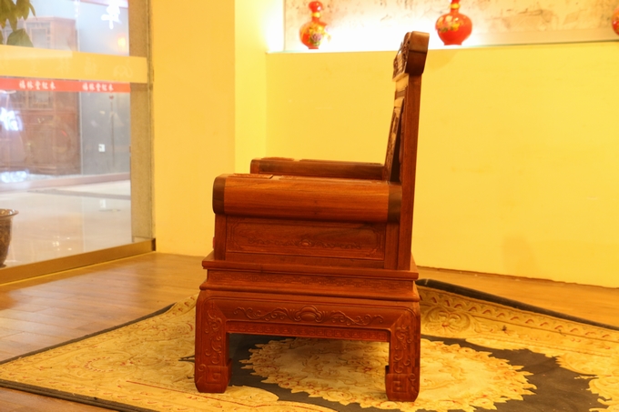 該款沙發(fā)整體之表現(xiàn)顯得極為嚴密厚實,無一處鏤空之雕飾,在最上端背板處的中間部分為留有一些花紋之邊幅加以修飾,顯得極為浮美雅觀。而在其左右兩側(cè)則另雕繪有“麒麟戲珠”與“雛鳥朝鳳”兩處紋飾圖案:“麒麟戲珠”紋飾設(shè)計地較為特別,如草龍紋一般,除頭部精細雕刻外,其余四肢與形體均簡略化,身體部位采用一銜邊條帶狀的紋飾相串于圓珠內(nèi),頗顯靈動神韻;而“雛鳥朝鳳”的圖案則是在背板最上部的左右兩端,末端是饒有一圓弧之設(shè)計為修飾收尾,顯得極為婉轉(zhuǎn)柔和圓潤。紋飾的圖案為一只可愛的雛鳥深情脈脈含情注視著前方鳥鳳的場景,顯得實為溫馨。鳳凰處之設(shè)計處理地也與前面麒麟一同:頭部細化,其余簡略帶過,鳳凰處眼眸之雕飾顯得極為醒目,神情表現(xiàn)形態(tài)逼真,層次感和手觸感亦十分明瀝彰顯,而經(jīng)燙蠟處理的表面緬花材質(zhì)表現(xiàn)地也更為細膩淡雅,極盡奢華。