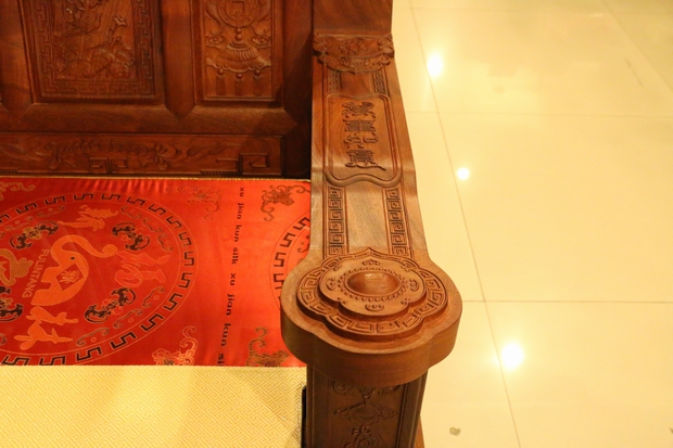 說完了背板,我們?cè)賮砜纯瓷嘲l(fā)的兩處扶手,在扶手上方的正中位置,雕繪有四個(gè)很清晰的字眼:萬事如意,字體仍是采用的古漢字字體,其筆畫彎延有致,筆鋒靈動(dòng)飄逸,頗具藝術(shù)美感氣息,令人陶醉。而在其扶手末端之位置處,則是一分三層雕刻設(shè)計(jì)的立體紋飾圖案,用手輕撫摸之,層次立體感及舒適感十分明顯。另在扶手的外部側(cè)面處則還形象地雕繪有一框花籃,花籃內(nèi)花團(tuán)齊簇,顯得十分美艷,富貴華麗。
