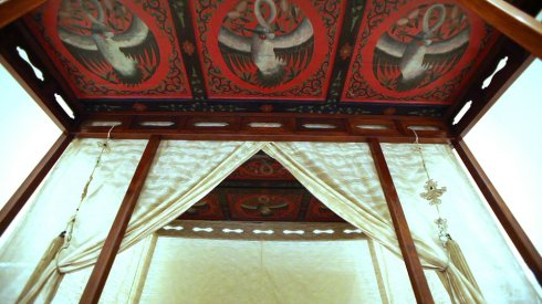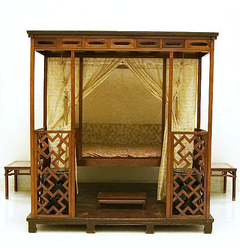 拔步床簡直就是個小房子,是建在木質(zhì)地坪上的房中房。床的四周掛上帷幔,是極為私密的空間。有些甚至幾重帷幔,連床前的門廊也遮掩起來,冬天是和暖的溫床,夏天驅(qū)避蚊蟲襲擾,在南方使用較多。